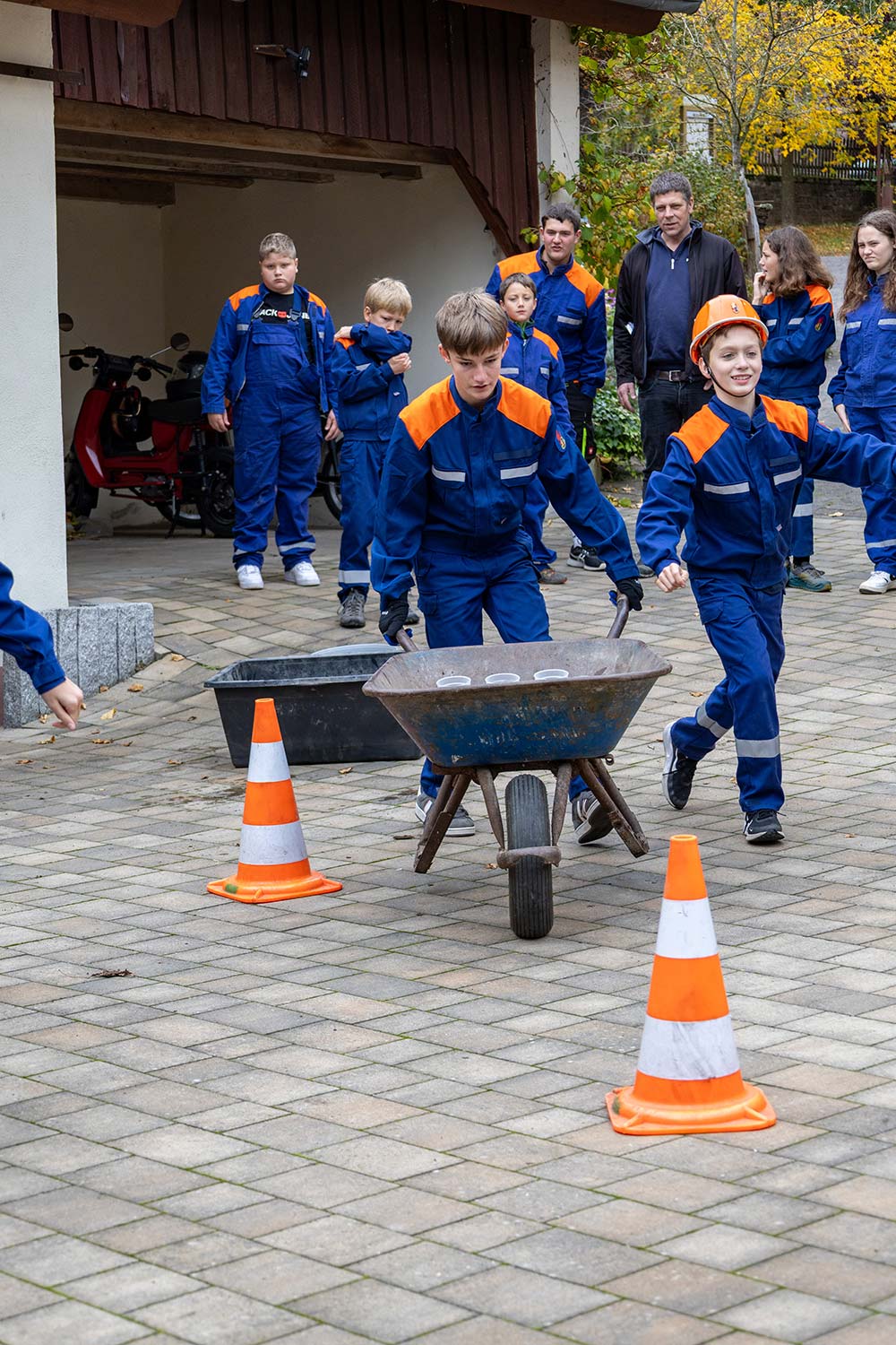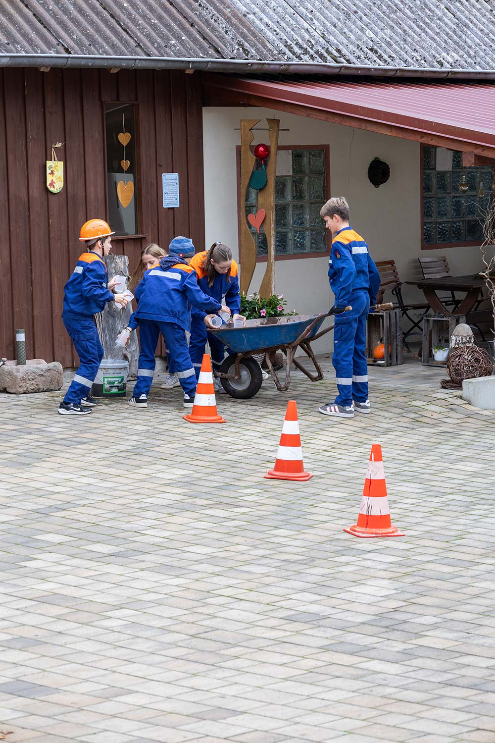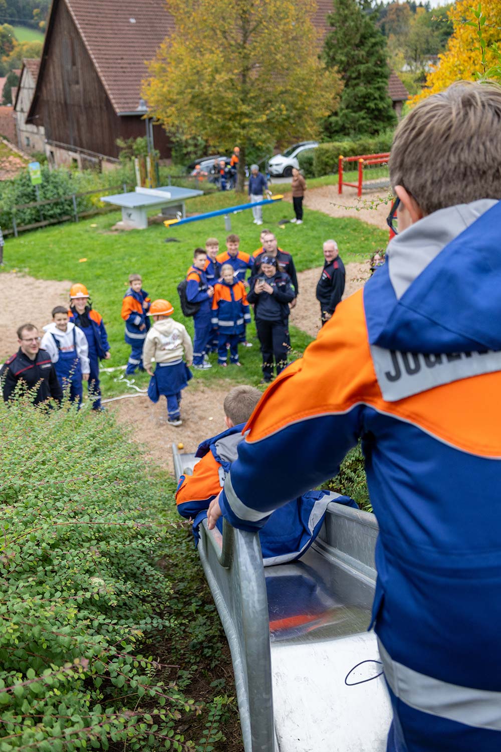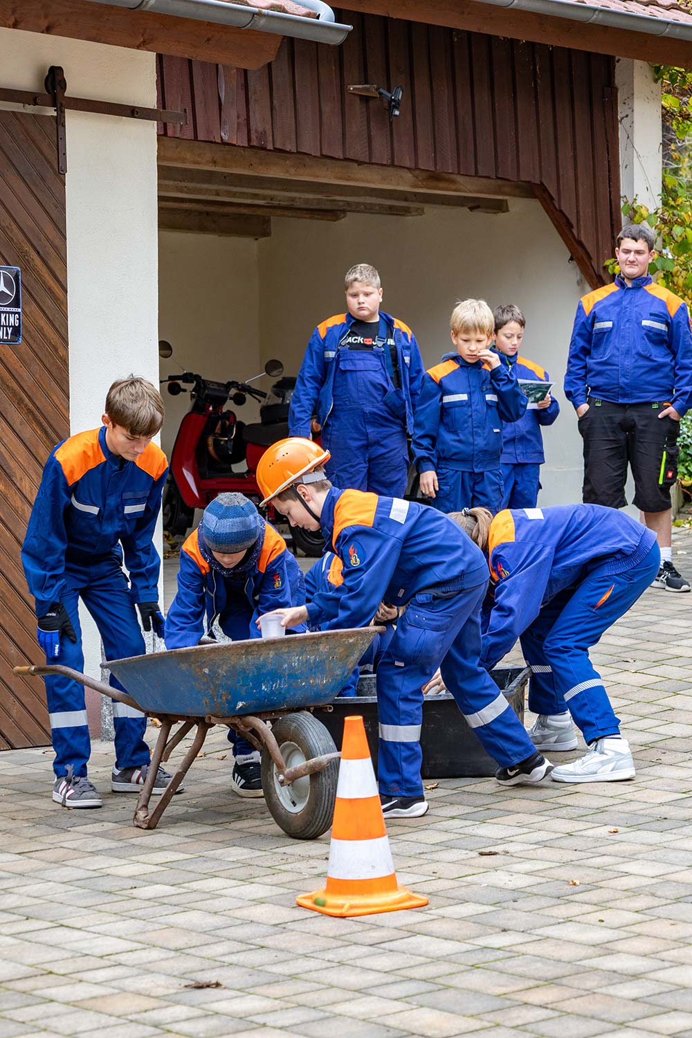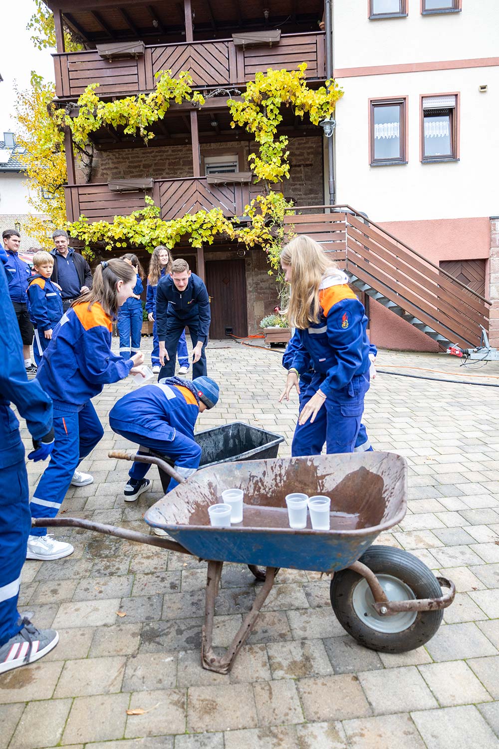 Im Rahmen des Weinfestes zum 85. Gründungsjubiläum der heutigen Feuerwehr-Abteilung Hollerbach trafen sich die Jugendgruppen am Sonntag Nachmittag. Die sechs Spielstationen waren von den Jugendgruppenleitern vorbereitet und betreut worden. Die Spielstationen waren das Team-Labyrinth der Jugendgruppe (JG) Hettingen, Becher-Transport (JG Buchen), Tastspiel (JG Götzingen), Minigolf (JG Hettigenbeuern), Stelzenlauf (JG Hainstadt) und Wassertransport mit einem Schubkarren.