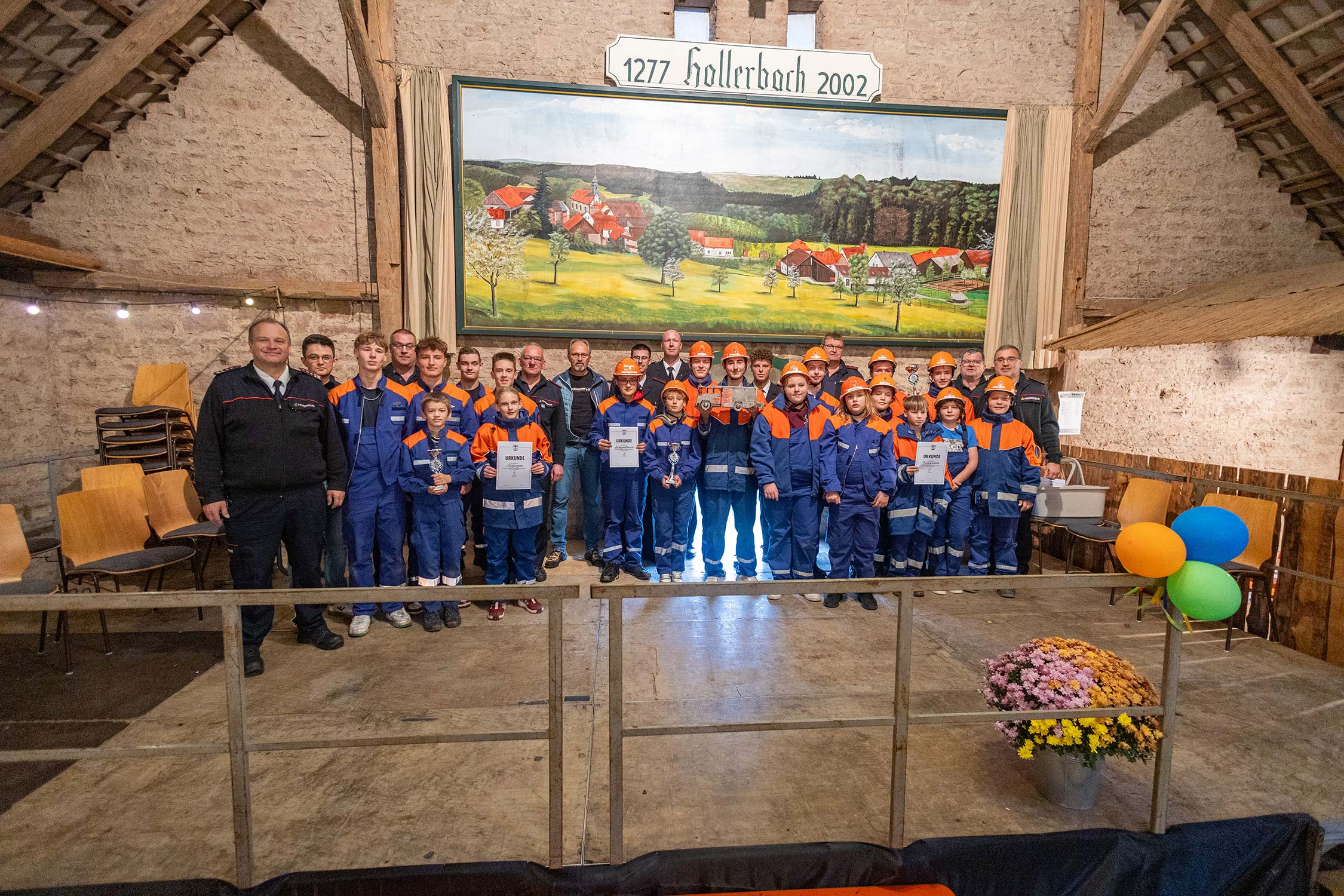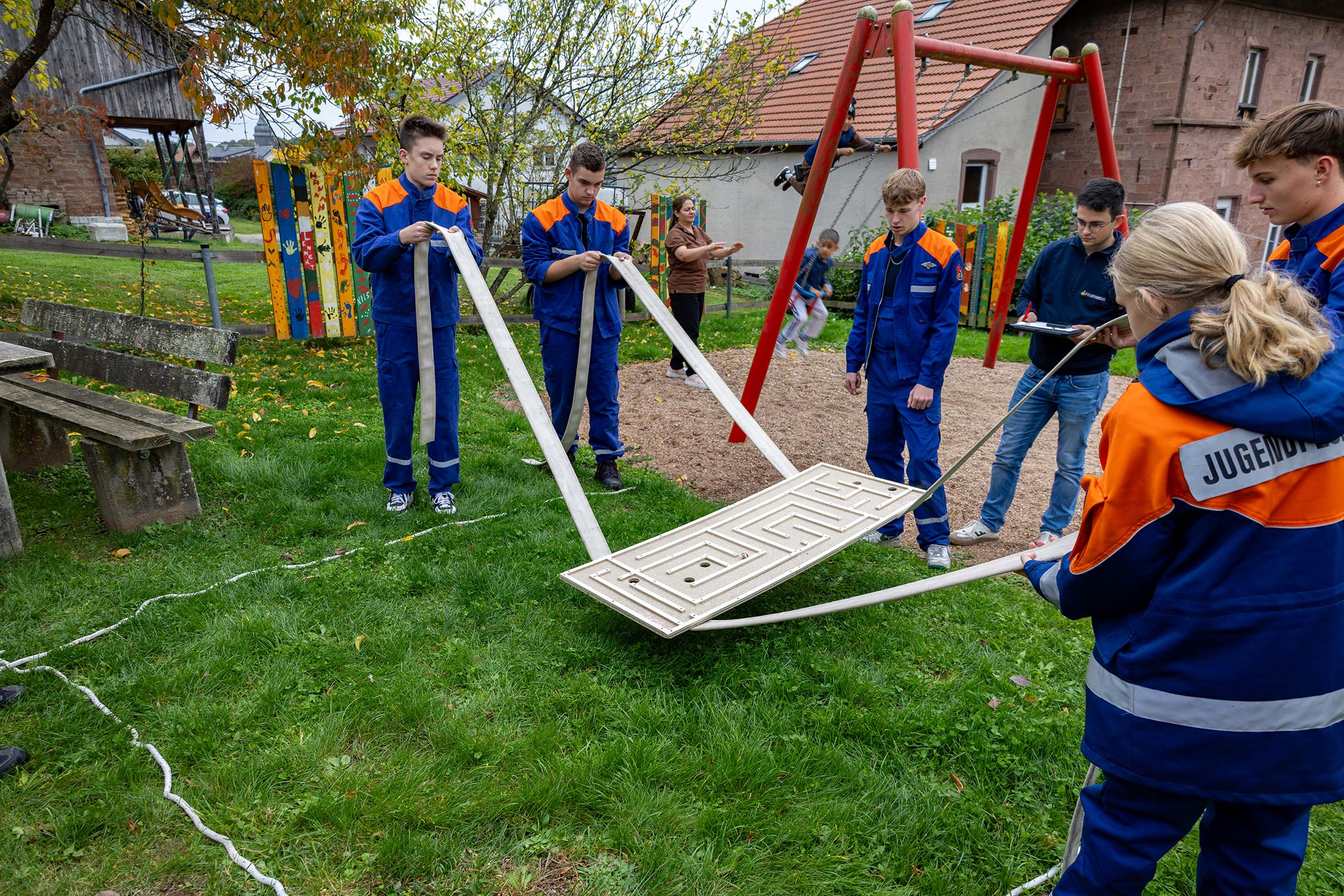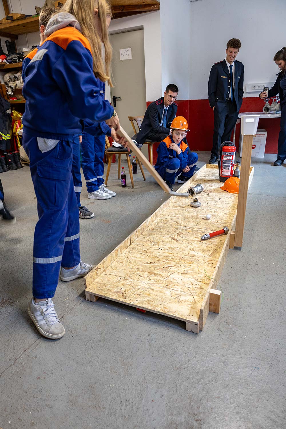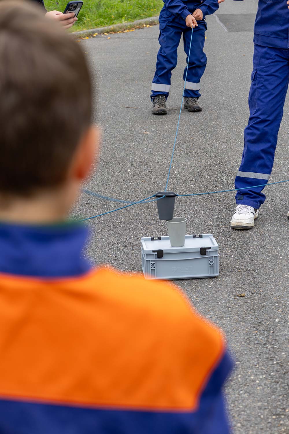 Im Rahmen des Weinfestes zum 85. Gründungsjubiläum der heutigen Feuerwehr-Abteilung Hollerbach trafen sich die Jugendgruppen am Sonntag Nachmittag. Die sechs Spielstationen waren von den Jugendgruppenleitern vorbereitet und betreut worden. Die Spielstationen waren das Team-Labyrinth der Jugendgruppe (JG) Hettingen, Becher-Transport (JG Buchen), Tastspiel (JG Götzingen), Minigolf (JG Hettigenbeuern), Stelzenlauf (JG Hainstadt) und Wassertransport mit einem Schubkarren.