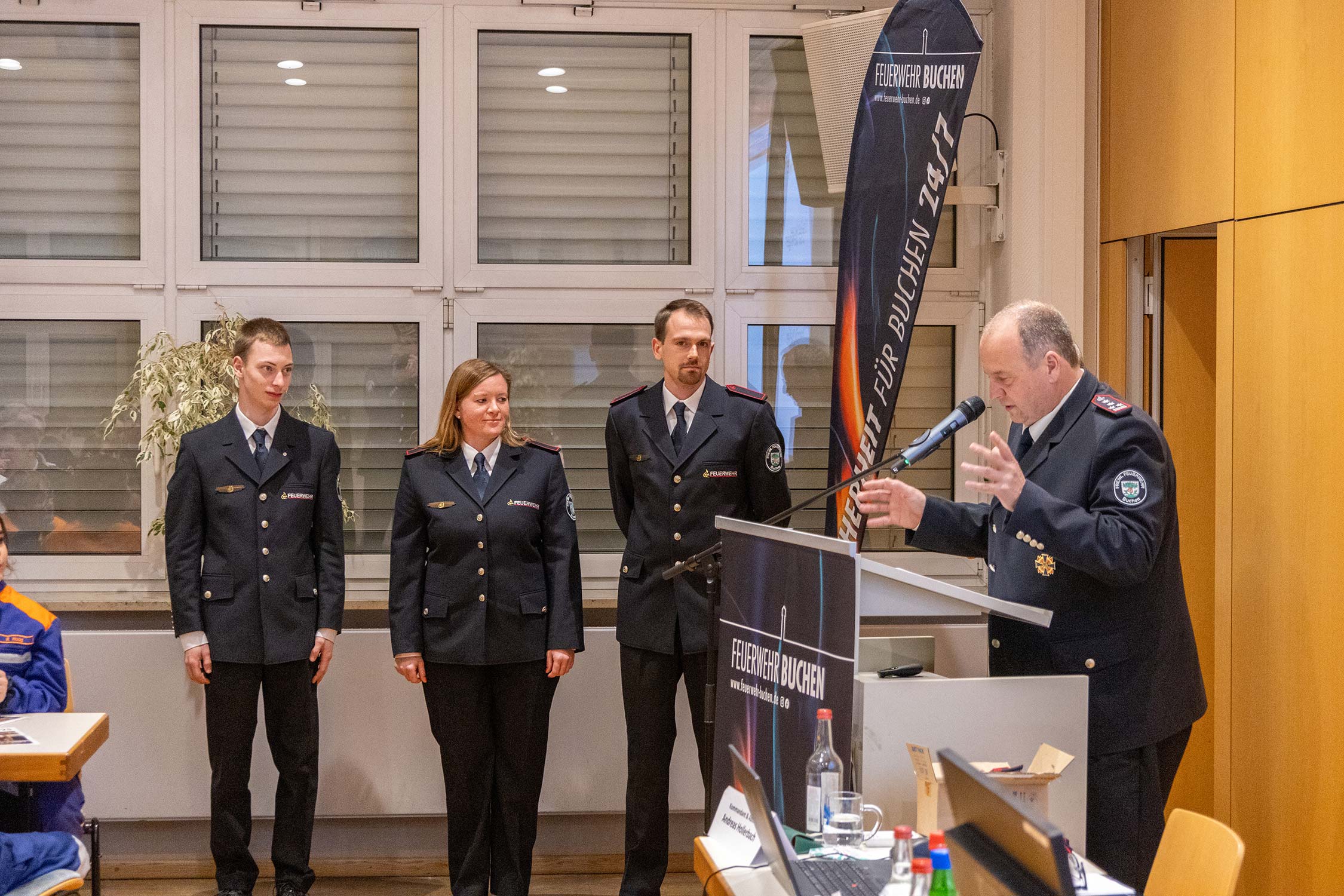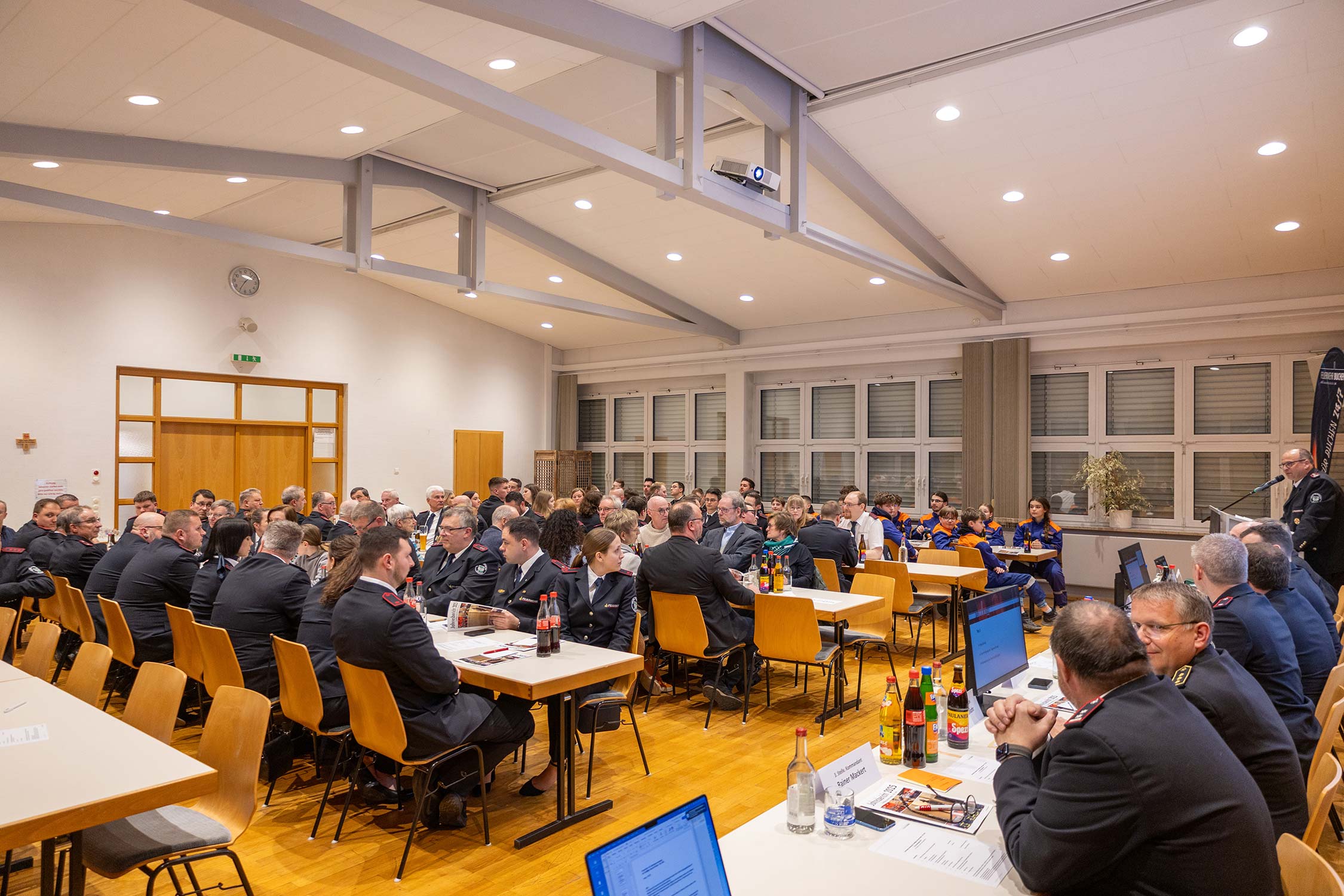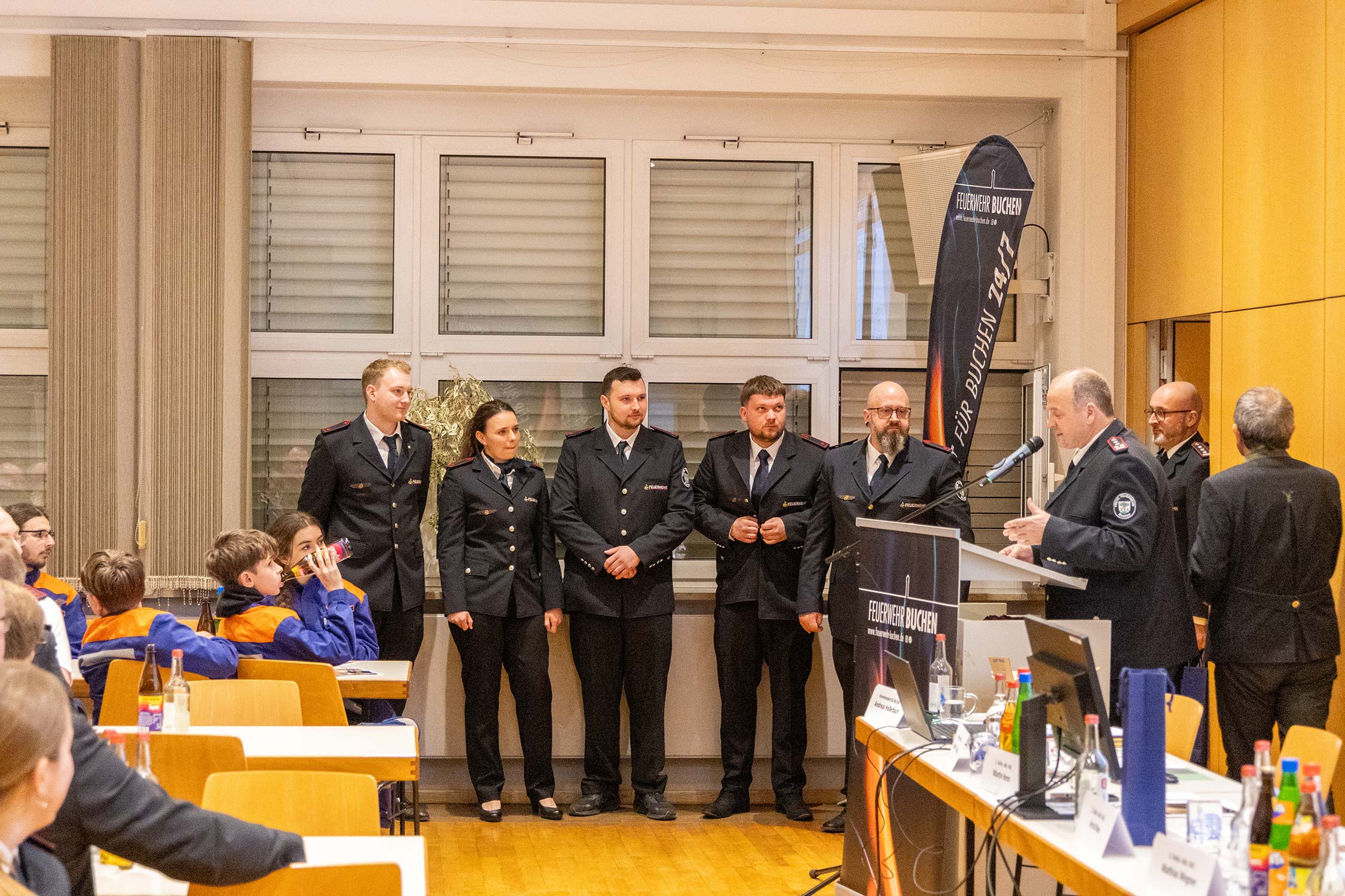 Auch zahlreiche Beförderungen und Ehrungen standen auf der Tagesordnung. Neu in die Einsatzabteilung aufgenommen wurde Julia Kirschenlohr. Aus der Jugendfeuerwehr wechselte Finn Hollerbach in die Einsatzabteilung. Beförderungen erhielten mehrere Feuerwehrangehörige: Zum Feuerwehrmann bzw. zur Feuerwehrfrau wurden Lisa Berlinger, Steffen Hornig und Jannik Keller befördert. Die drei Sterne als Hauptfeuerwehrmann bzw. Hauptfeuerwehrfrau dürfen ab sofort Christin Lauer, Luca Watkins, Markus Eder, Tom Scheufler und Jonathan Philipp tragen. Außerdem wurden Matthias Grimm und Rene Bäuerlein zu Oberlöschmeistern ernannt. Für langjährigen aktiven Feuerwehrdienst wurden Pascal Böhrer und Felix Hercher (15 Jahre), Jürgen Brünner, Kathrin Klohe und Sven Klohe (25 Jahre) sowie posthum Alexander Schüßler (40 Jahre) gewürdigt. Für besonders langjährige Mitgliedschaft wurden Ernst Schöllig (60 Jahre) und Klaus Pflüger (70 Jahre) geehrt.