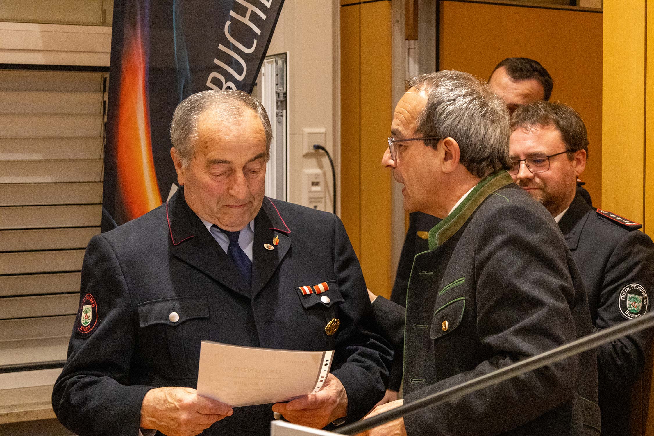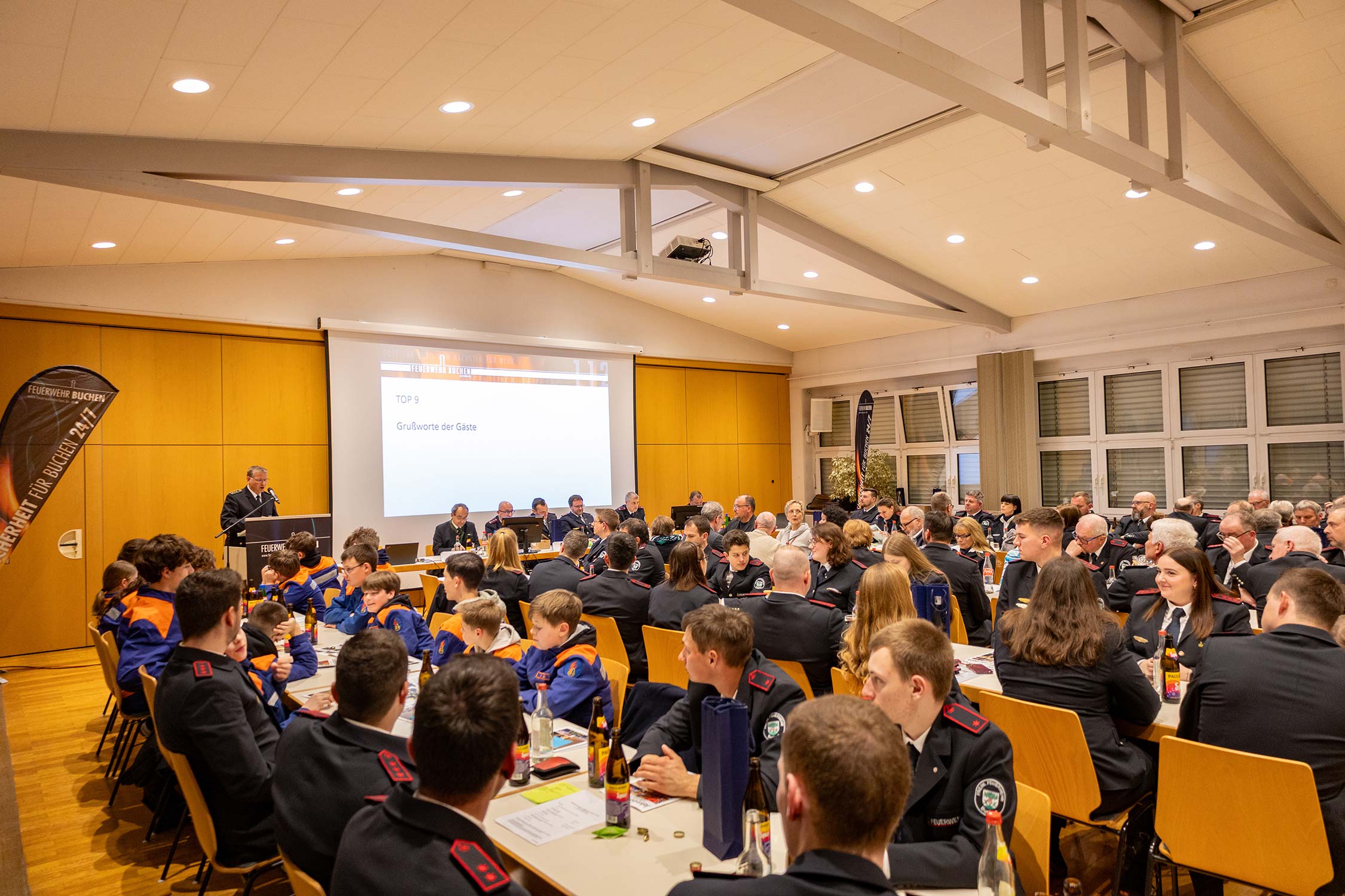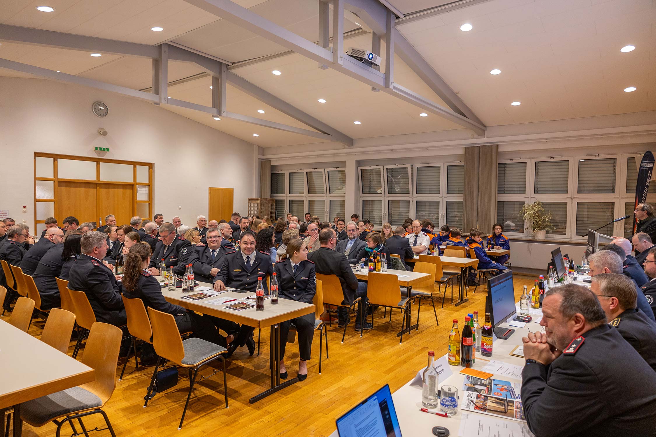 Auch zahlreiche Beförderungen und Ehrungen standen auf der Tagesordnung. Neu in die Einsatzabteilung aufgenommen wurde Julia Kirschenlohr. Aus der Jugendfeuerwehr wechselte Finn Hollerbach in die Einsatzabteilung. Beförderungen erhielten mehrere Feuerwehrangehörige: Zum Feuerwehrmann bzw. zur Feuerwehrfrau wurden Lisa Berlinger, Steffen Hornig und Jannik Keller befördert. Die drei Sterne als Hauptfeuerwehrmann bzw. Hauptfeuerwehrfrau dürfen ab sofort Christin Lauer, Luca Watkins, Markus Eder, Tom Scheufler und Jonathan Philipp tragen. Außerdem wurden Matthias Grimm und Rene Bäuerlein zu Oberlöschmeistern ernannt. Für langjährigen aktiven Feuerwehrdienst wurden Pascal Böhrer und Felix Hercher (15 Jahre), Jürgen Brünner, Kathrin Klohe und Sven Klohe (25 Jahre) sowie posthum Alexander Schüßler (40 Jahre) gewürdigt. Für besonders langjährige Mitgliedschaft wurden Ernst Schöllig (60 Jahre) und Klaus Pflüger (70 Jahre) geehrt.