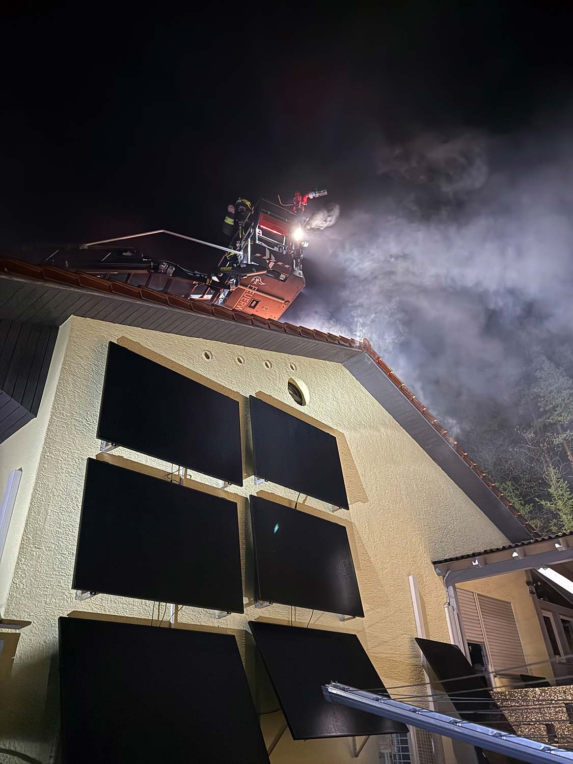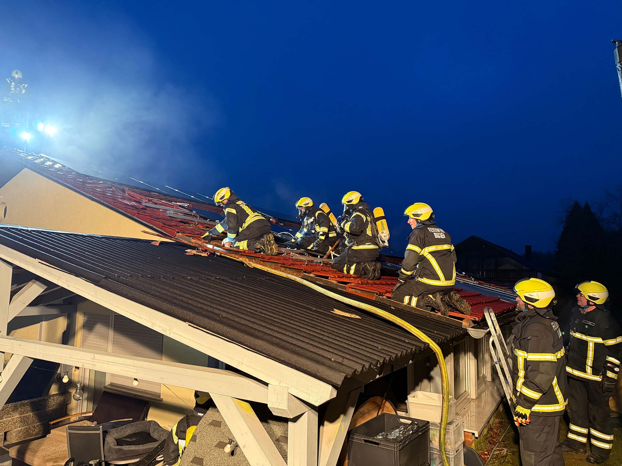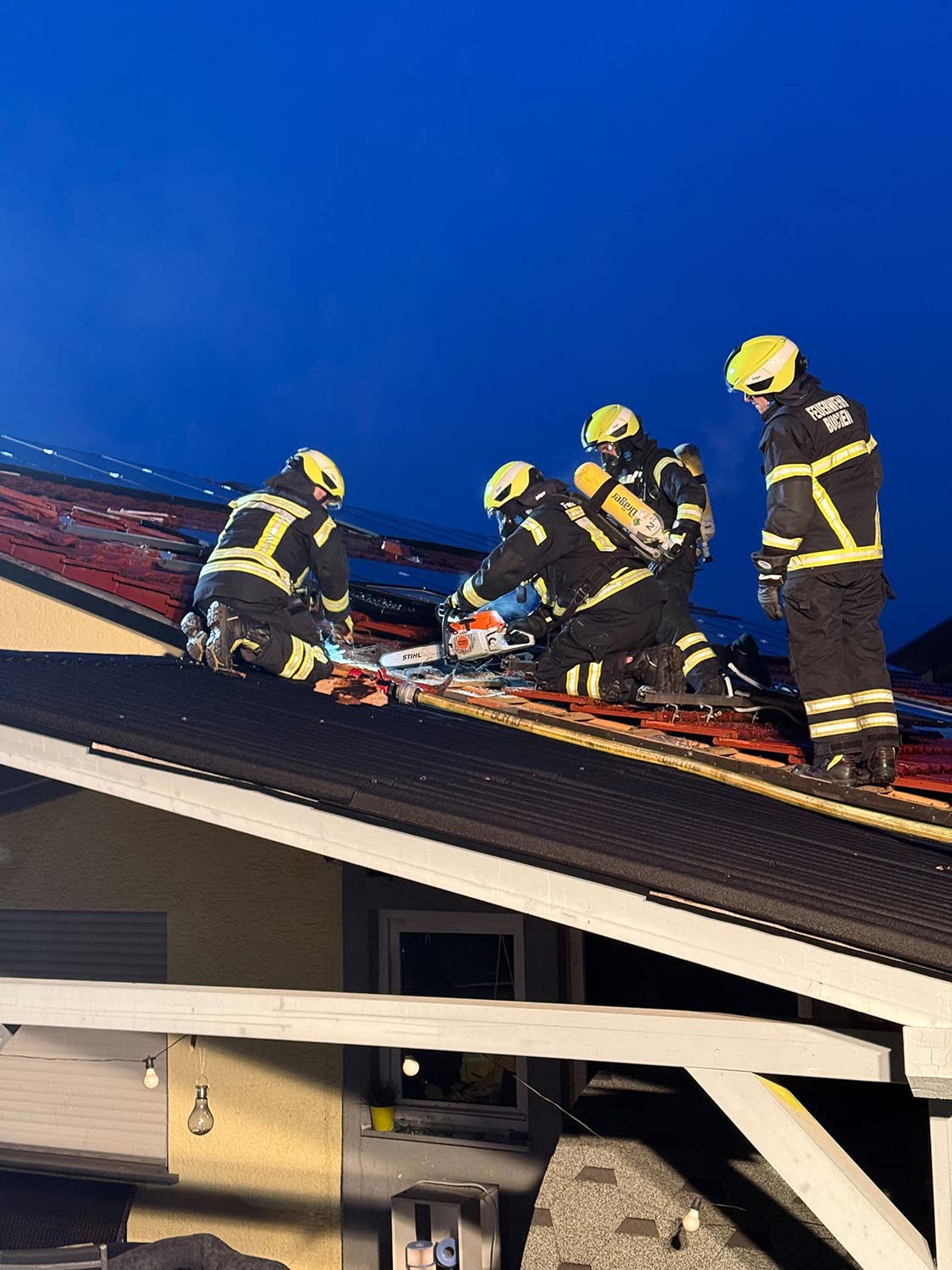 Die Feuerwehr brachte die Bewohner ins Freie, das DRK untersuchte und betreute diese anschließend. Die Einsatzkräfte konnten den Brand schnell unter Kontrolle bringen und öffnete anschließend die Dachhaut zur Kontrolle, ob weitere Teile der Dachkonstruktion in Mitleidenschaft gezogen wurden. Leicht klimmende Teile wurden abgelöscht bzw. gekühlt.