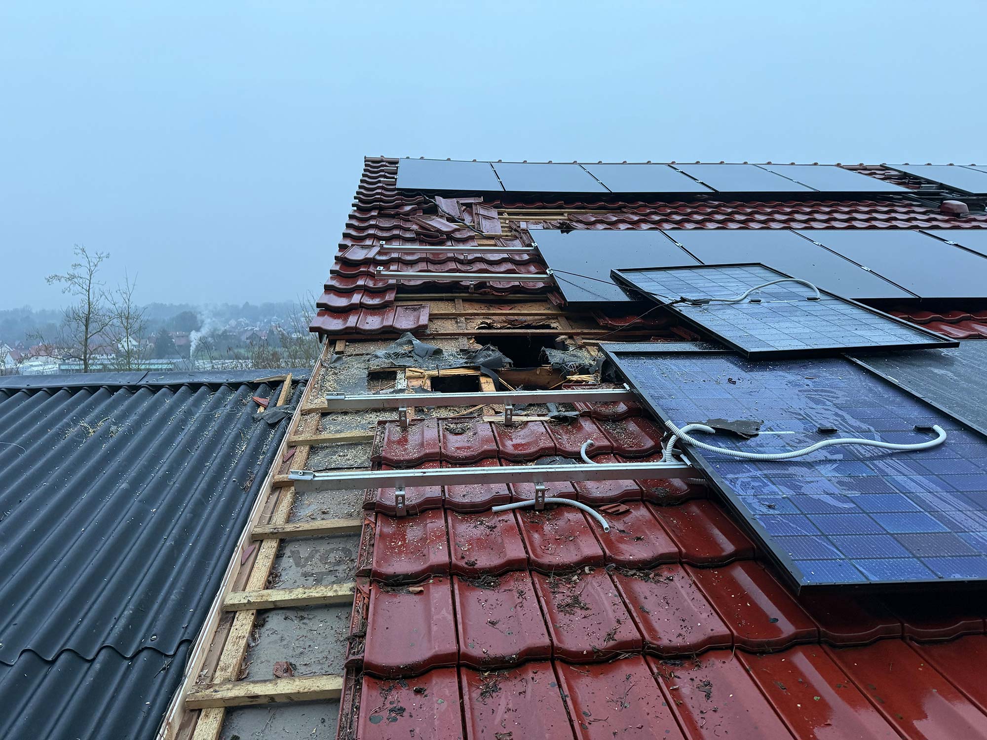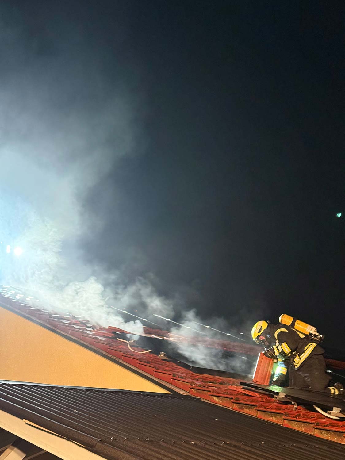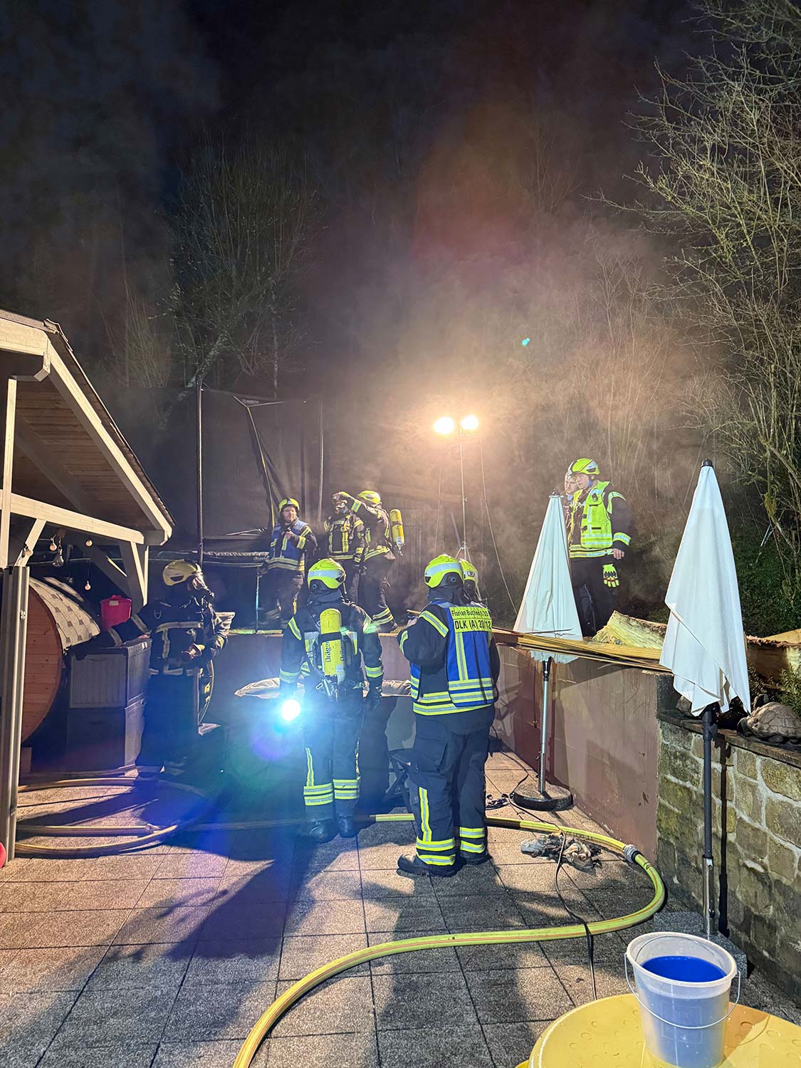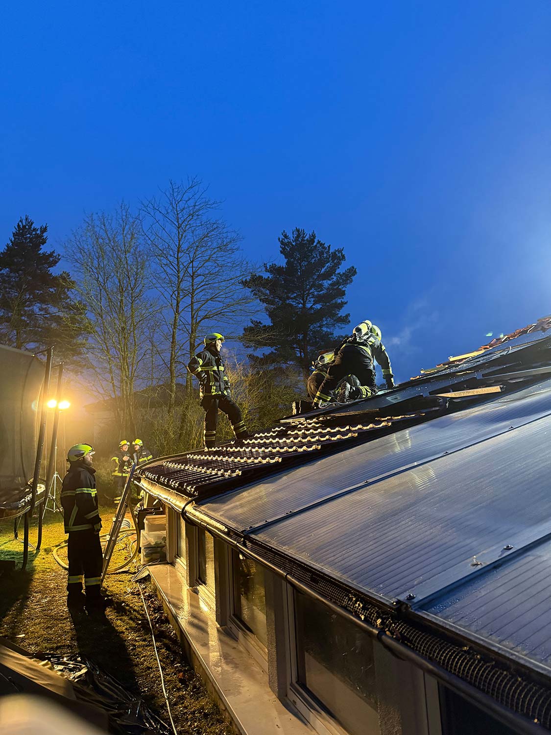 Die Feuerwehr brachte die Bewohner ins Freie, das DRK untersuchte und betreute diese anschließend. Die Einsatzkräfte konnten den Brand schnell unter Kontrolle bringen und öffnete anschließend die Dachhaut zur Kontrolle, ob weitere Teile der Dachkonstruktion in Mitleidenschaft gezogen wurden. Leicht klimmende Teile wurden abgelöscht bzw. gekühlt.