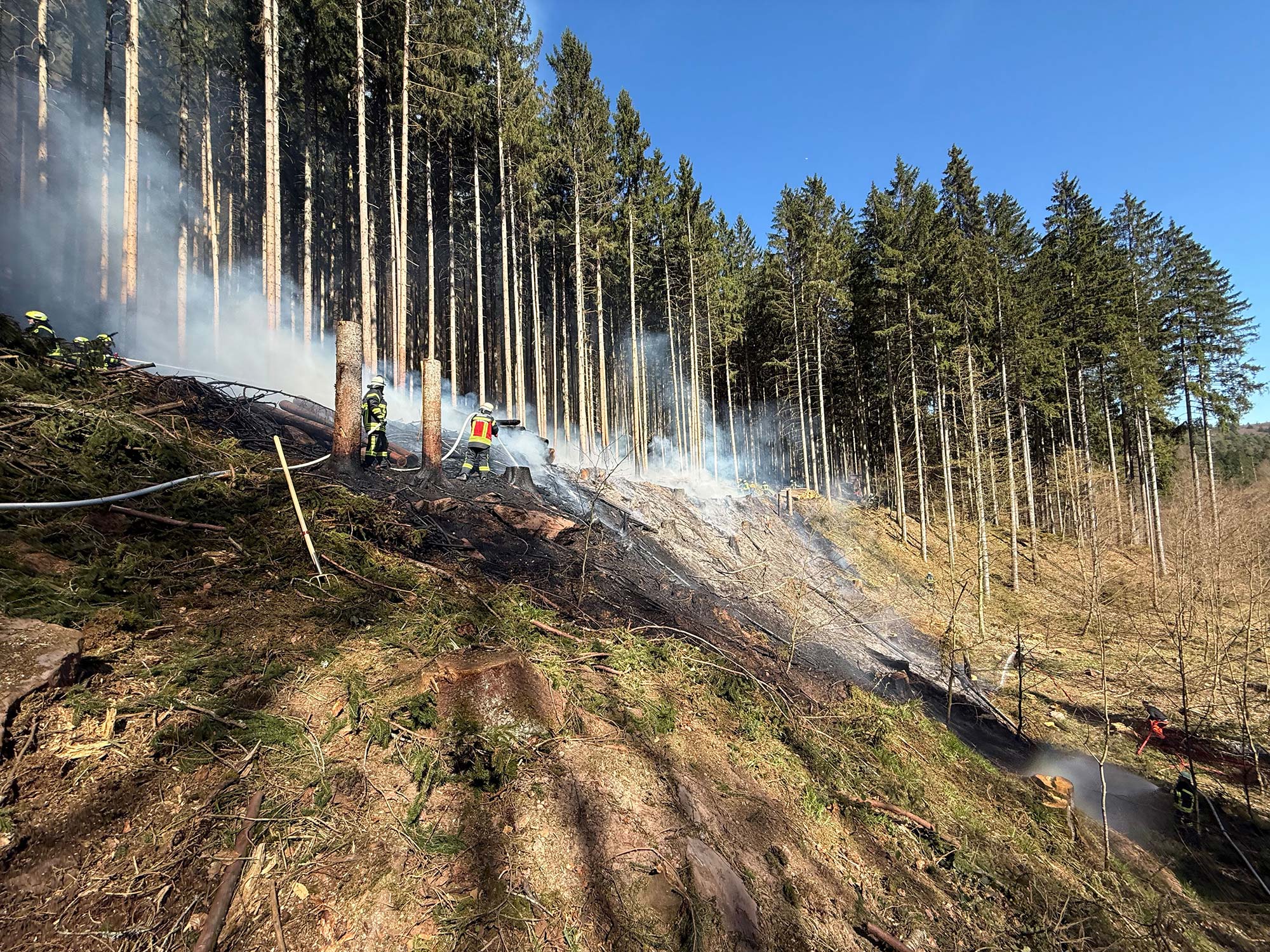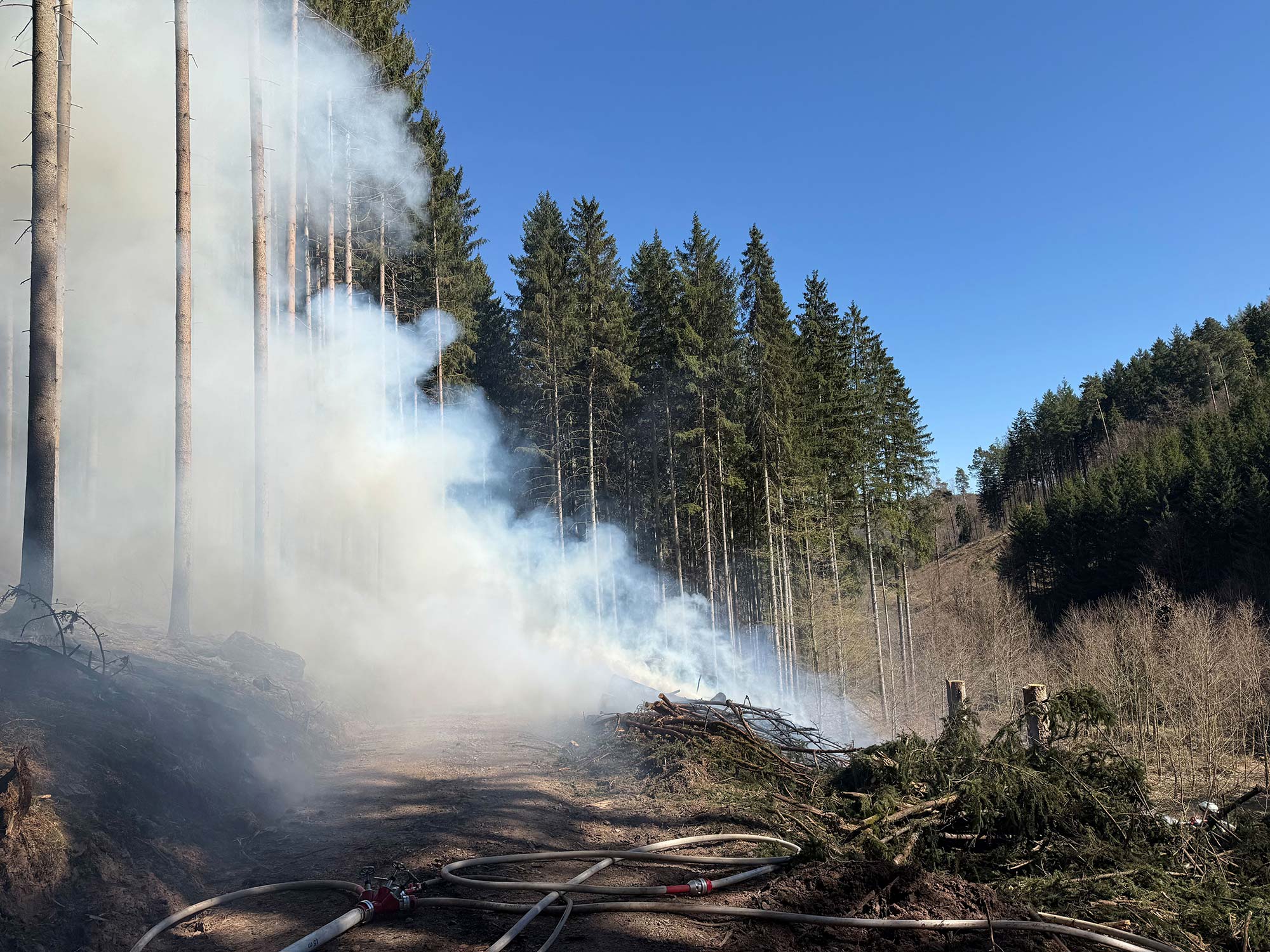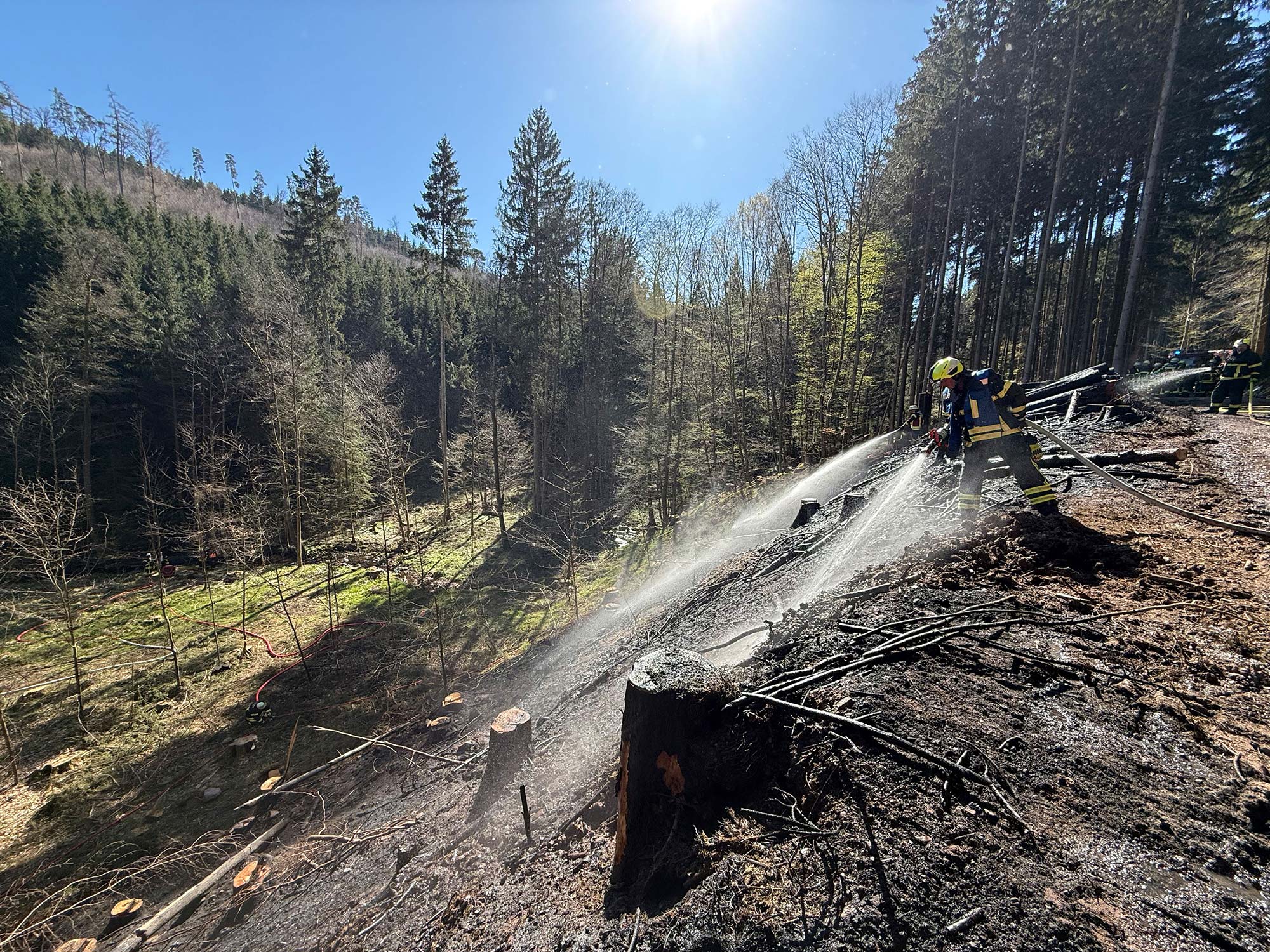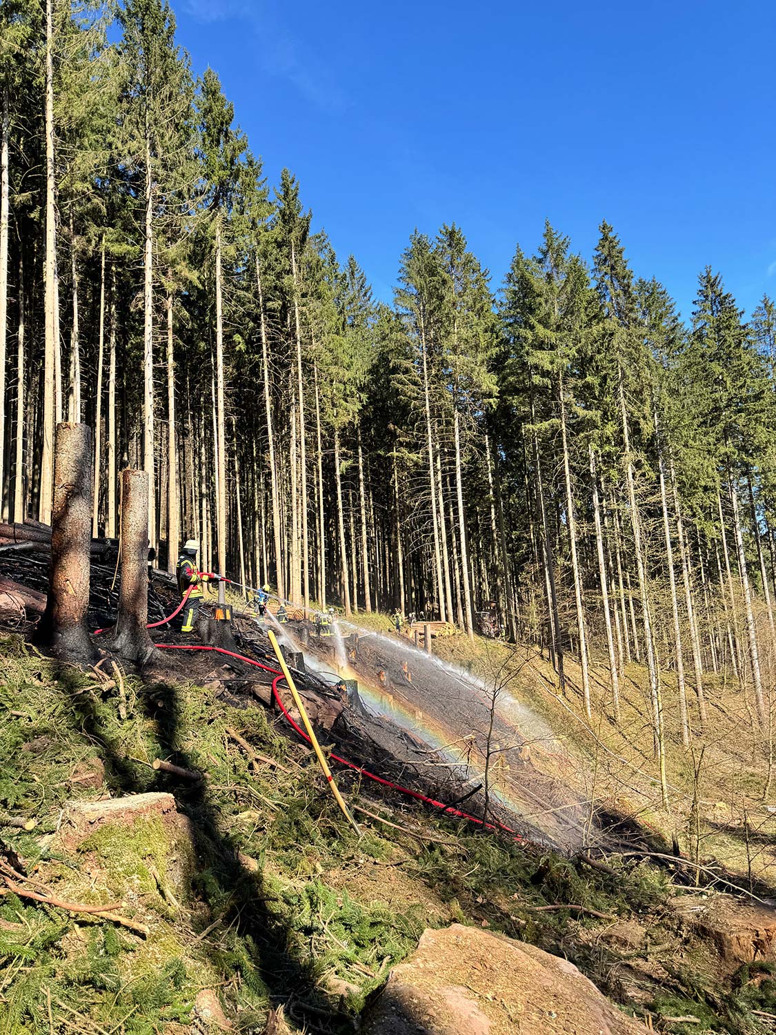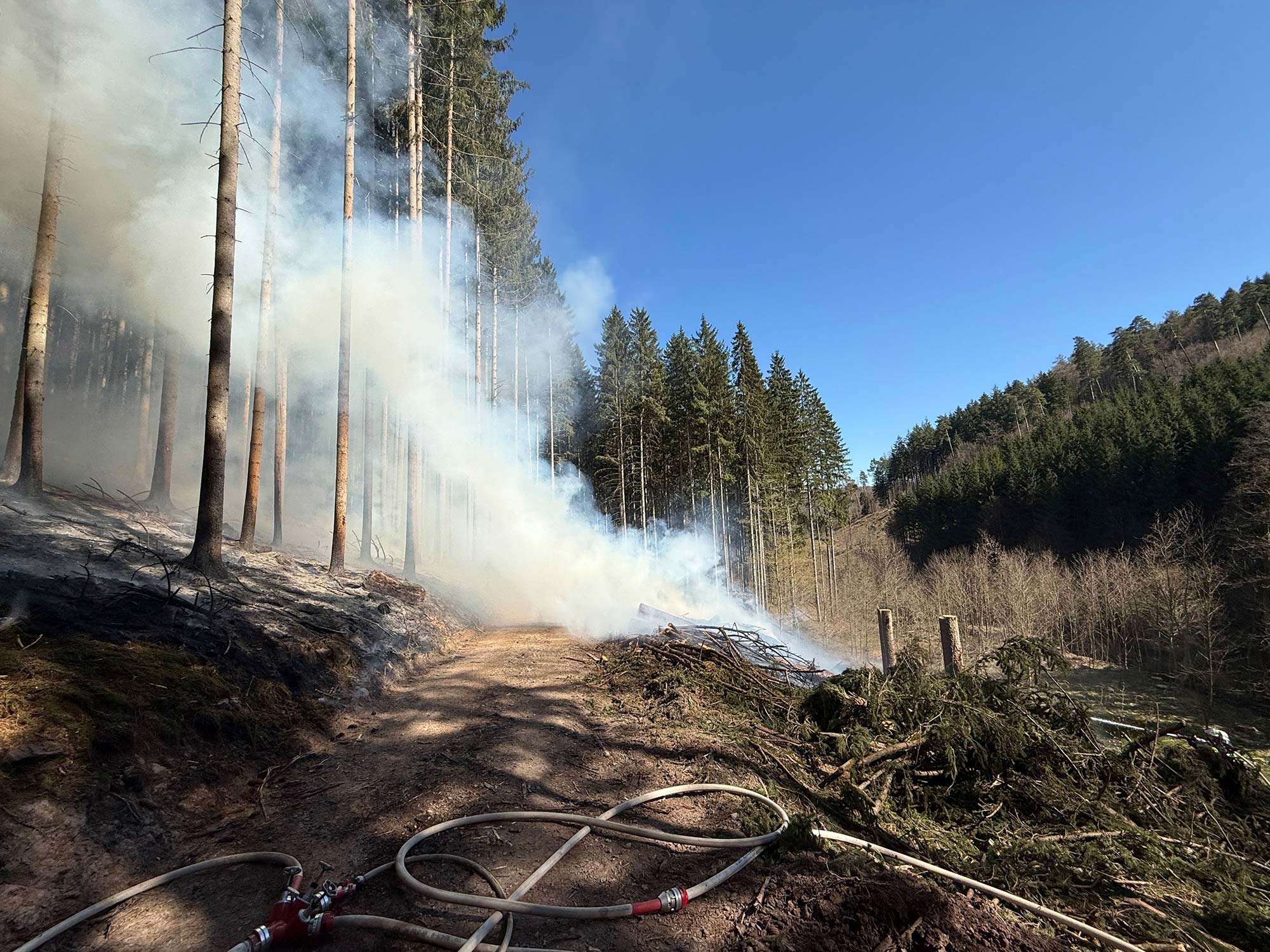 Nachdem die Einsatzkräfte die Brandstelle im Wald ausfindig machen konnten, konnte der Brand an zwei Steilhängen zügig in Gewalt gebracht werden. Die Lage mitten im Wald erschwerte die Löscharbeiten, da der Wassernachschub nur aus dem Steinbächle unterhalb nach oben gepumpt werden konnte. Um Wasser auf den oberhalb gelegenen Hang zu bringen, musste Wasser mit Feuerwehrfahrzeugen im Pendelverkehr aus Steinbach herbei geschafft werden. Nachdem der Brand abgelöscht worden war, transportierte ein Rückefahrzeug die in Mitleidenschaft gezogenen Stämme an den Parkplatz am Stürzenhardter Brückchen wo die Feuerwehr die Stämme nochmals ausgiebig wässerte.