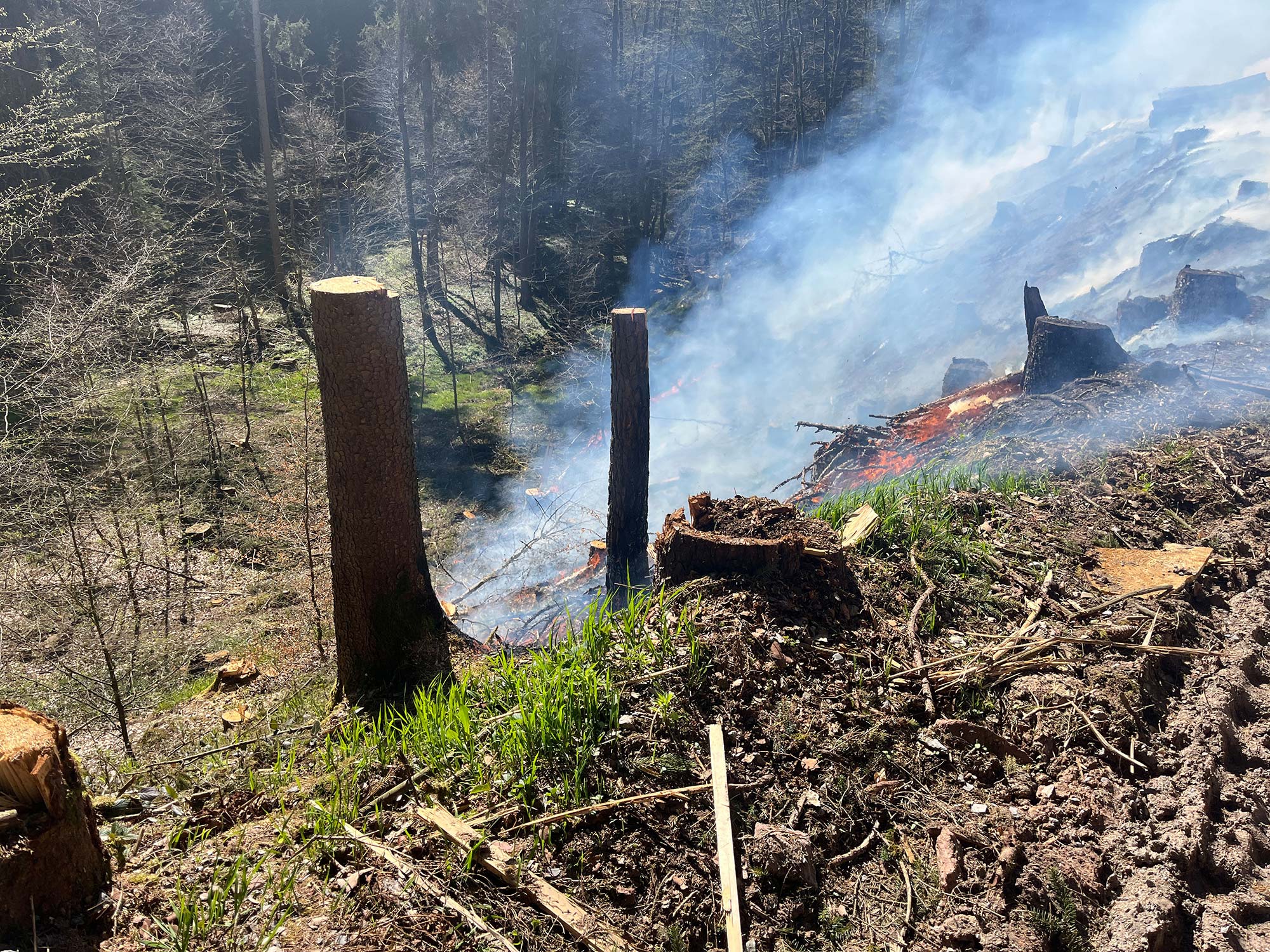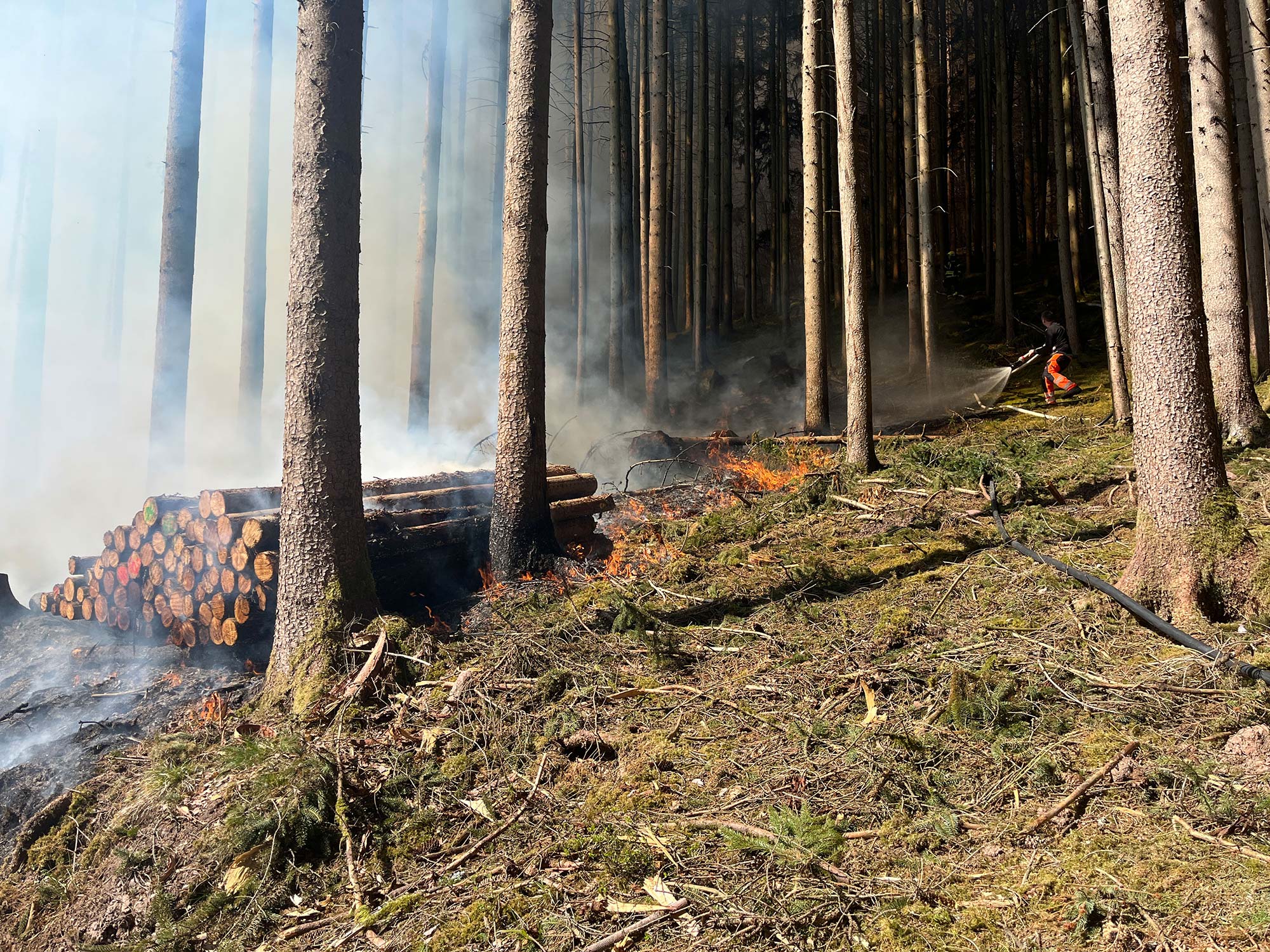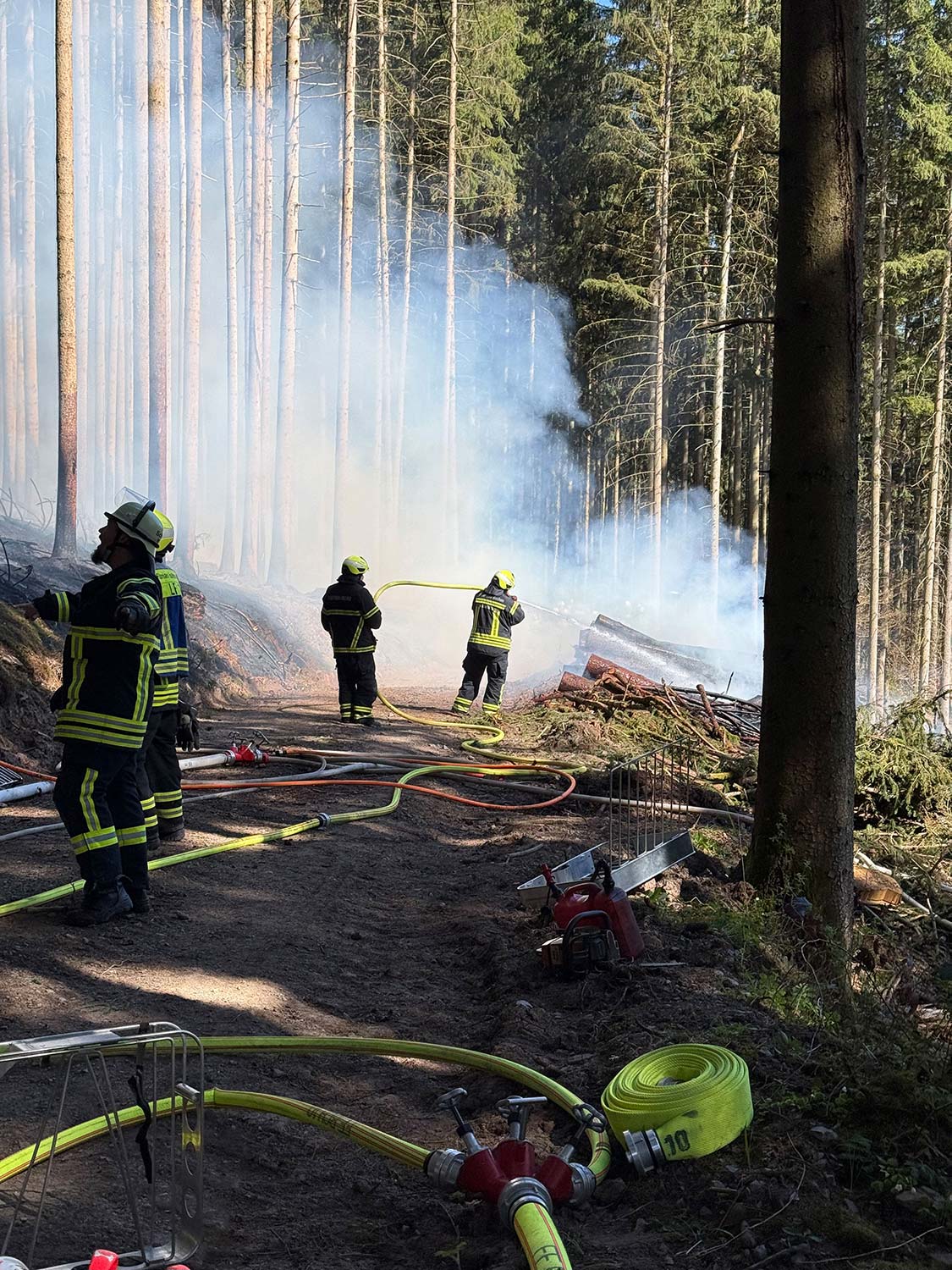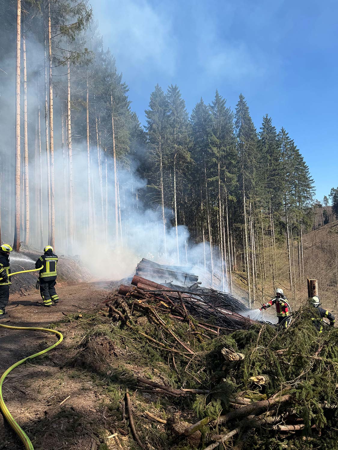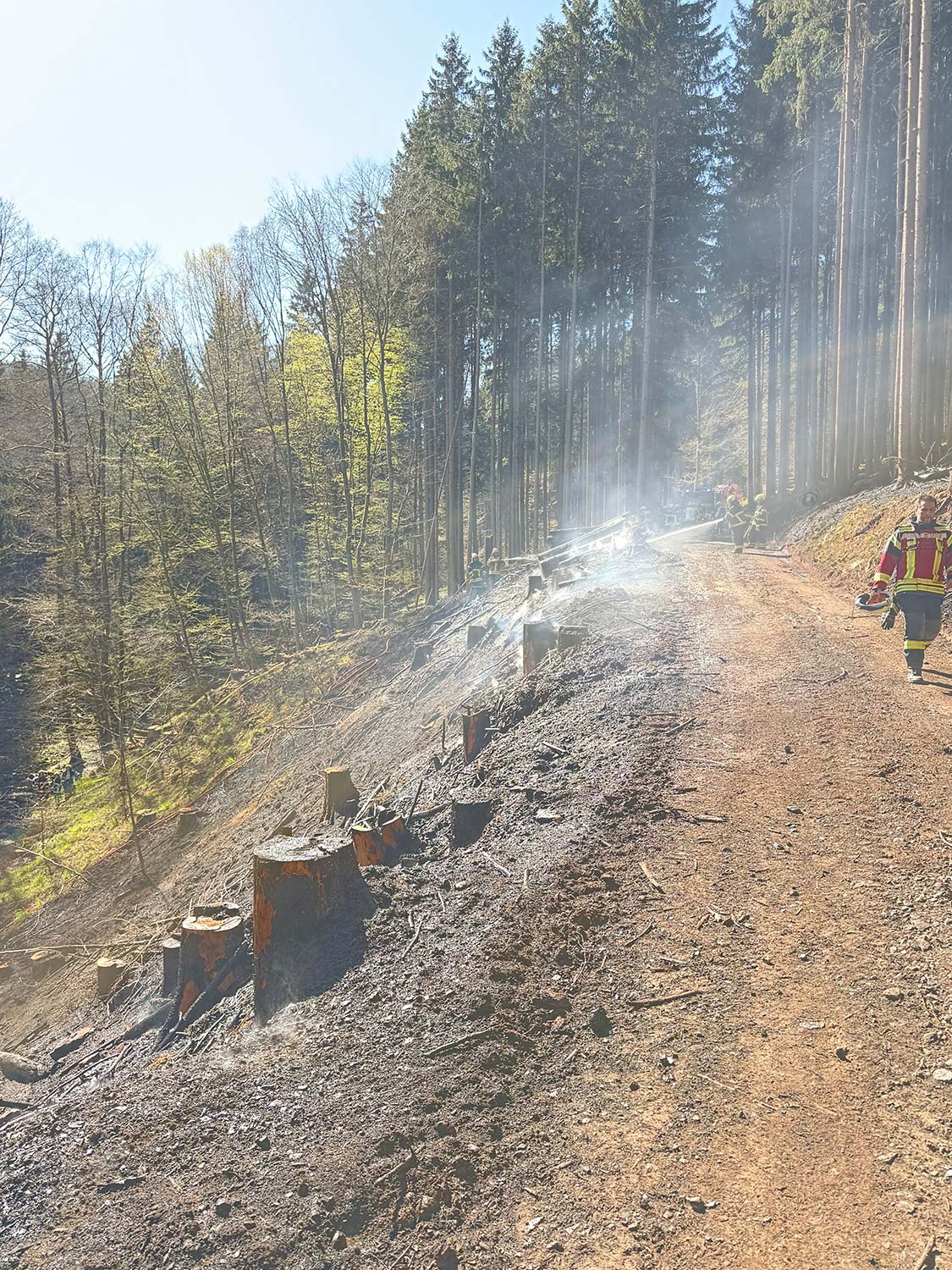 Nachdem die Einsatzkräfte die Brandstelle im Wald ausfindig machen konnten, konnte der Brand an zwei Steilhängen zügig in Gewalt gebracht werden. Die Lage mitten im Wald erschwerte die Löscharbeiten, da der Wassernachschub nur aus dem Steinbächle unterhalb nach oben gepumpt werden konnte. Um Wasser auf den oberhalb gelegenen Hang zu bringen, musste Wasser mit Feuerwehrfahrzeugen im Pendelverkehr aus Steinbach herbei geschafft werden. Nachdem der Brand abgelöscht worden war, transportierte ein Rückefahrzeug die in Mitleidenschaft gezogenen Stämme an den Parkplatz am Stürzenhardter Brückchen wo die Feuerwehr die Stämme nochmals ausgiebig wässerte.